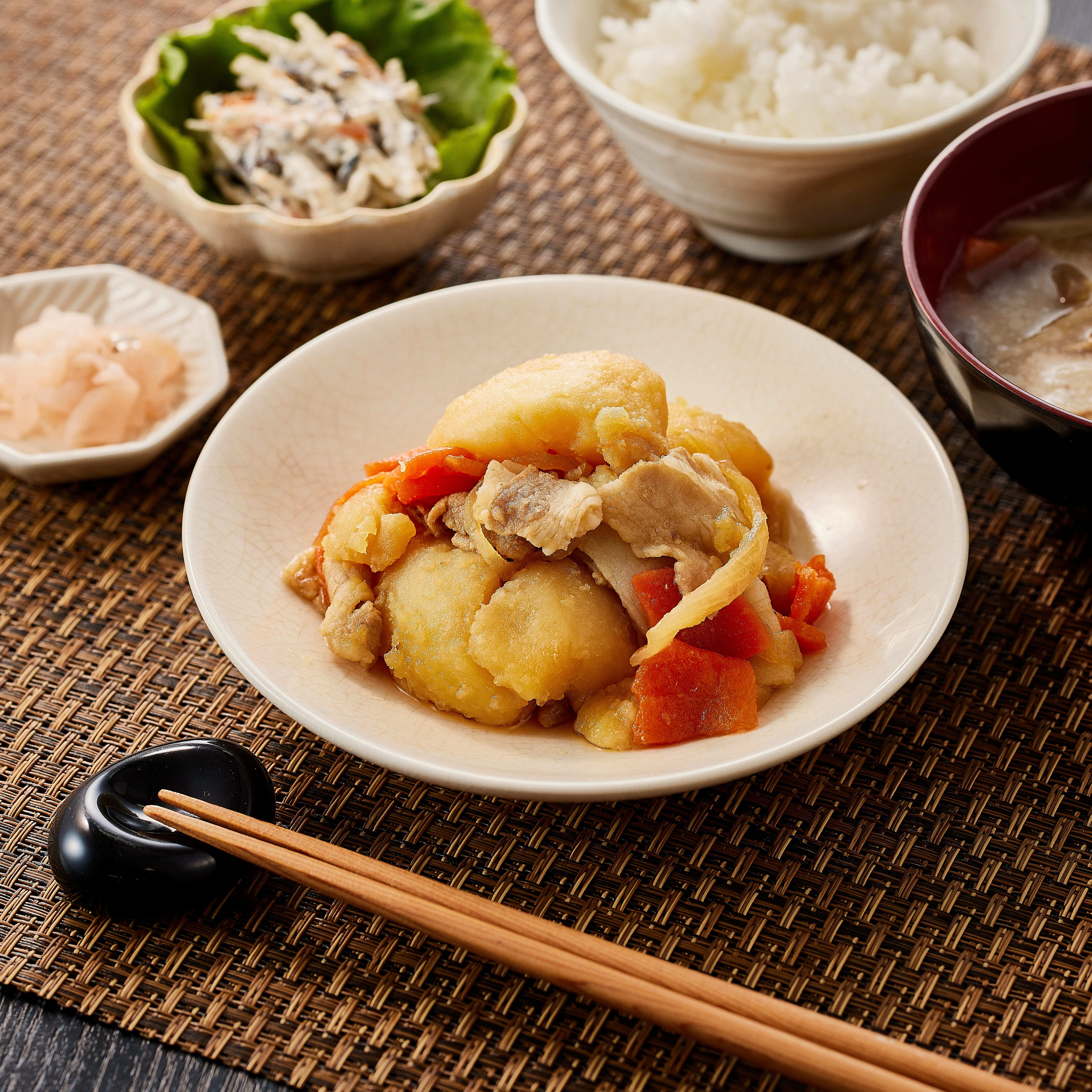 じゃがいも(国産)、にんじん、たまねぎ、豚肉、しらたき、かつお節だし、しょうゆ、上白糖、本みりん、食塩/水酸化カルシウム、加工デンプン、(一部に小麦・大豆・豚肉含む)