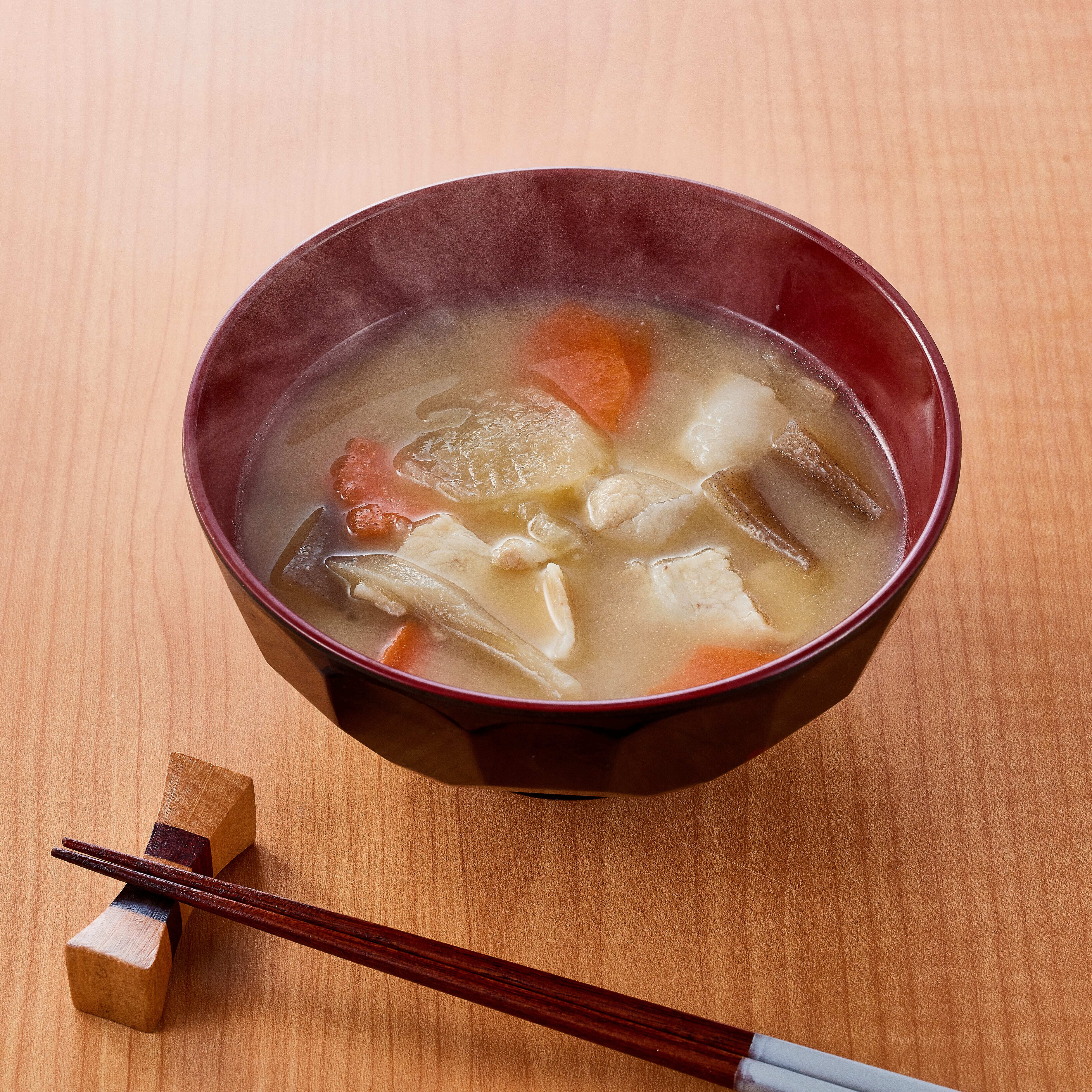 かつお節だし、大根(中国産)、豚肉、にんじん、こんにゃく、ごぼう、みそ/酒精、(一部に豚肉・大豆含む)
