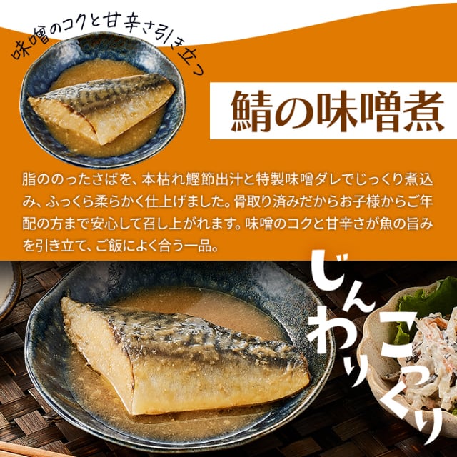 さば(ノルウェー産)、砂糖、みそ、かつお節だし、本みりん、でん粉、生姜ペースト、魚介エキス/酒精、(一部にさば・大豆を含む)