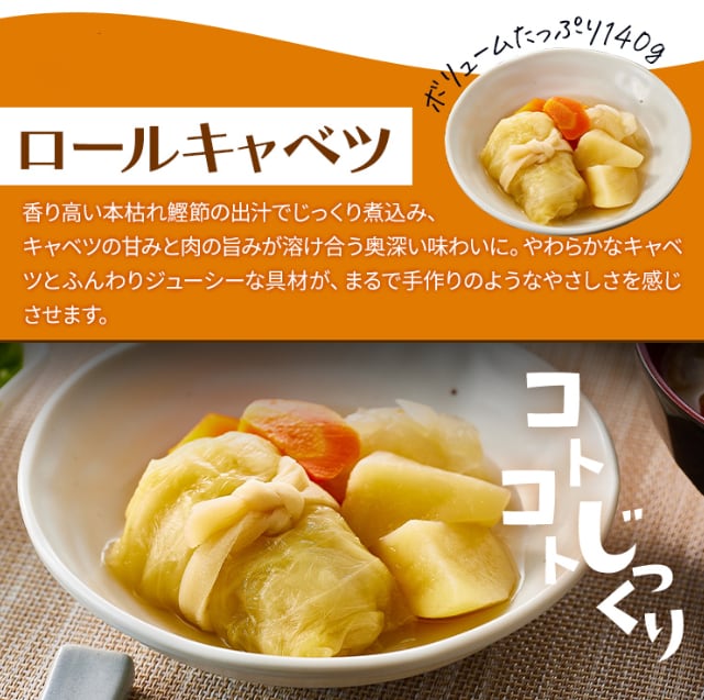野菜(たまねぎ、にんじん、じゃがいも)、ロールキャベツ(中国産)、かつお節だし、しょうゆ、本みりん、たん白加水分解物、食塩/調味料(核酸、アミノ酸)、漂白剤(二酸化硫黄)、(一部に小麦・大豆・豚肉含む)