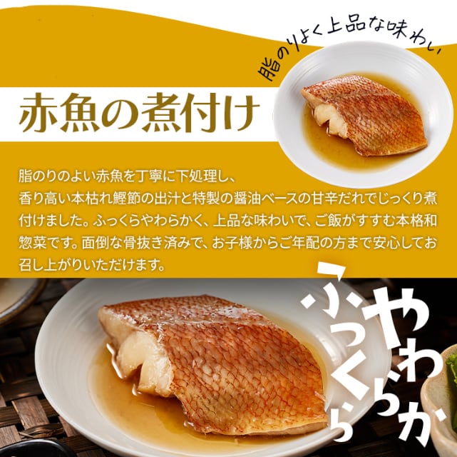 赤魚(アメリカ産)、かつお節だし、しょうゆ、砂糖、みりん、清酒、生姜ペースト、でん粉、(一部に大豆・小麦を含む)